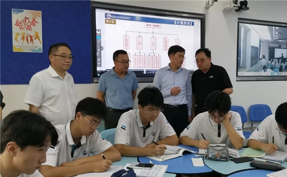 在华东理工大学附属闵行科技高中,调研组参观了学校智能化图书馆、远程教研、虚拟实验室、VR职业生涯体验系统、未来教室、校园“智脑”可视化系统等数字化建设应用的各类智能硬件和学习空间场景,了解学校信息化标杆校创建及数字化转型实践等情况。