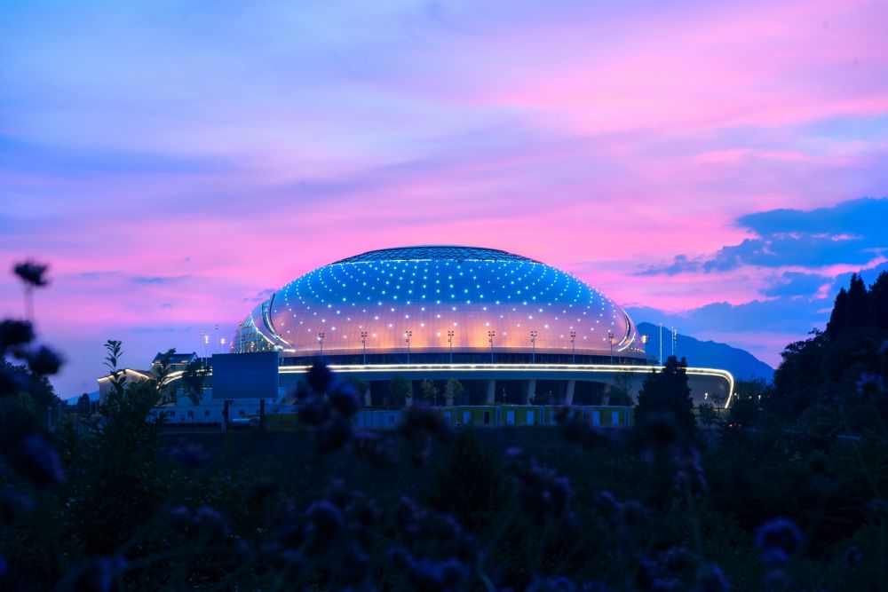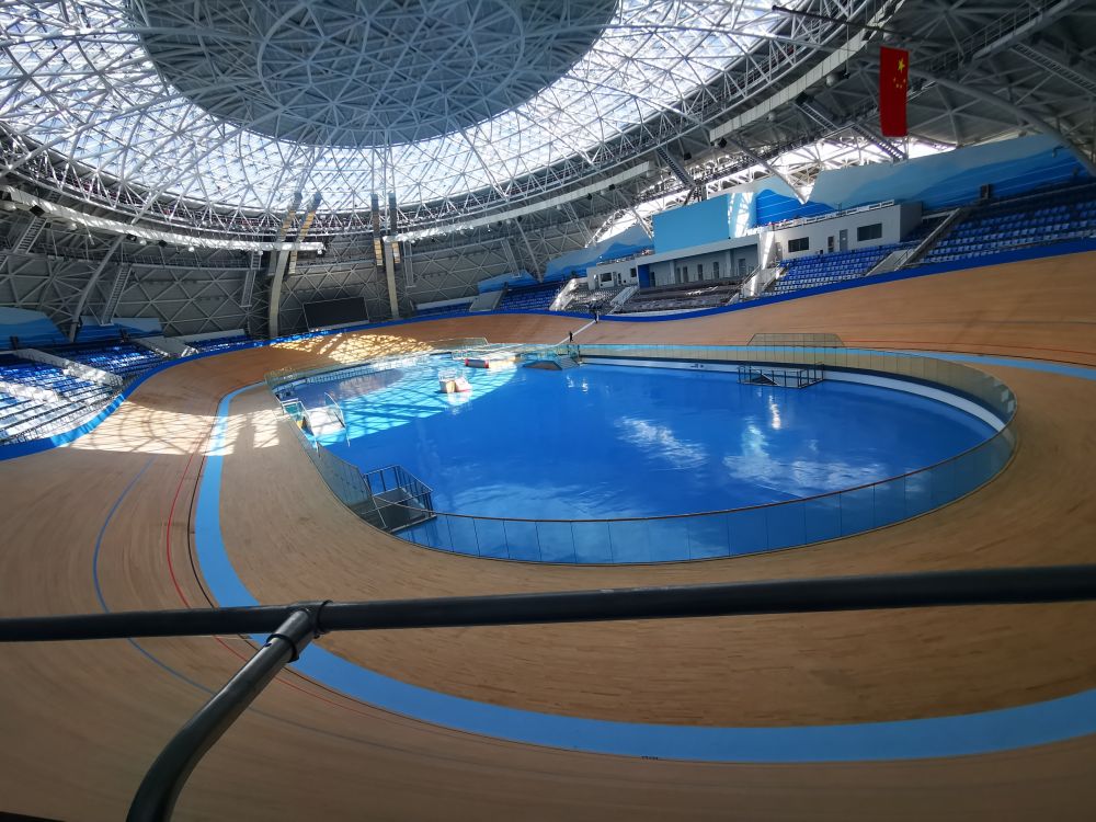 在这里,最引人注目的是以“朝阳鱼跃、千岛明珠”为设计理念建造的自行车馆。从远处眺望,场馆整体造型就像一颗藏于自然山水之间的明珠,屋面、幕墙的“渔文化”元素,像是跃出湖面的鱼儿泛起的层层涟漪。