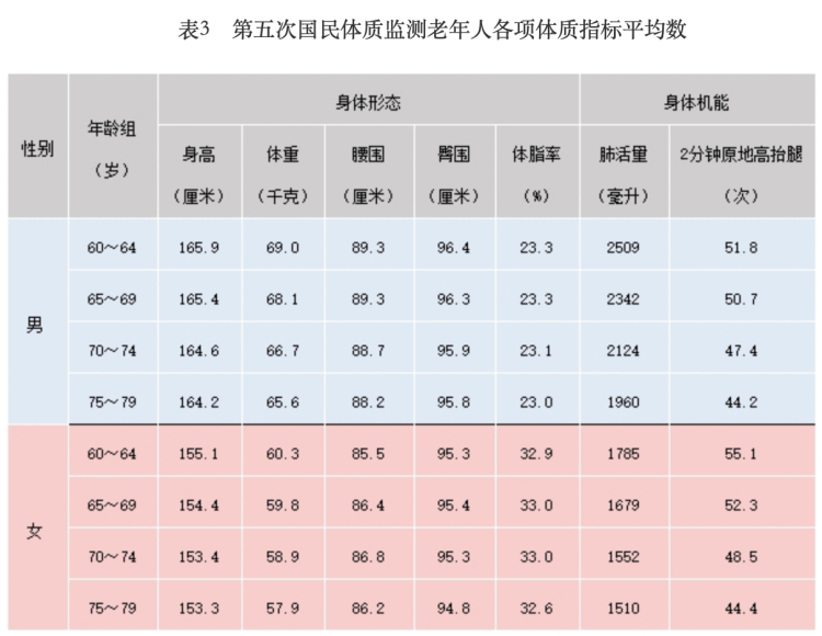 据国家体育总局发布的最新版《国民体质测定标准》,对身体形态、身体机能与身体素质三大部分指标进行了重新修订。据了解,中国成年人和老年人在身体机能各指标平均值随年轻增长成下降趋势。其中,代表身体素质的握力平均水平下降明显,而在参加力量锻炼的老年群体中,人数更是少之又少,女性比例仅有3.1%,老年男性也只有7.1%,显示出力量锻炼的普遍性缺乏。