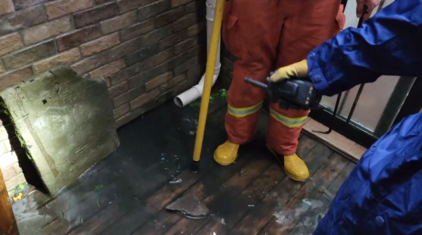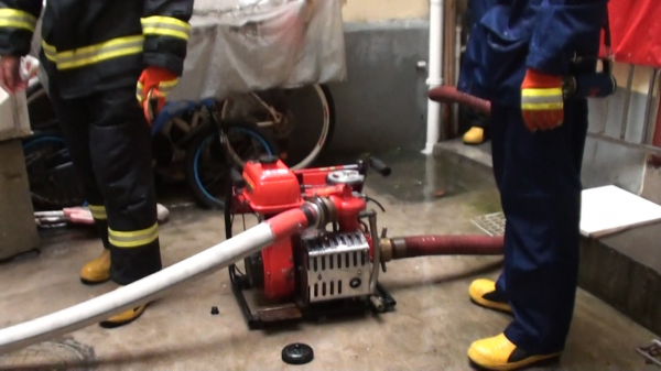 由于该老旧小区底层部分居民住宅地势有落差,排水能力较差,产生雨水倒灌现象。根据现场情况,指战员立即使用手抬机动泵进行排水,经过两个小时左右的奋战,居民家中水被排干。