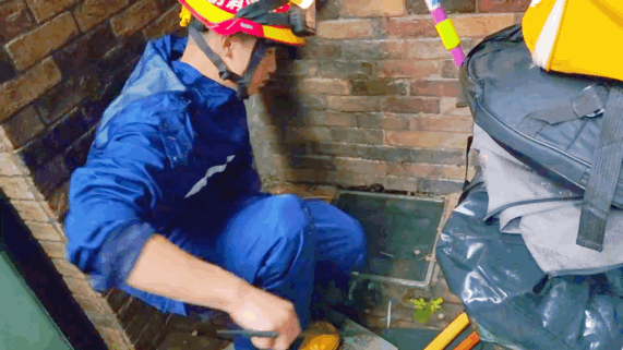 到场后,指战员利用工具挑起后院的窨井盖,使用专业清淤工具将沉淀在管道内的垃圾一点一点清捞出来,加速排水。