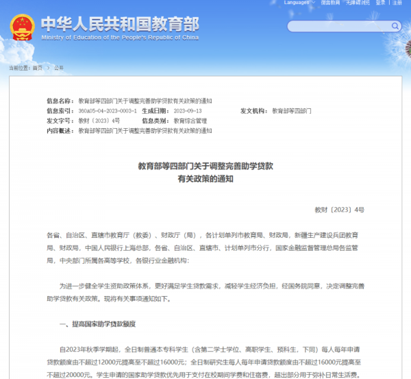 教育部等四部门发布关于调整完善助学贷款有关政策的通知,明确自2023年秋季学期起,全日制普通本专科学生(含第二学士学位、高职学生、预科生)每人每年申请贷款额度由不超过12000元提高至不超过16000元;全日制研究生每人每年申请贷款额度由不超过16000元提高至不超过20000元。来看新华社的报道↓