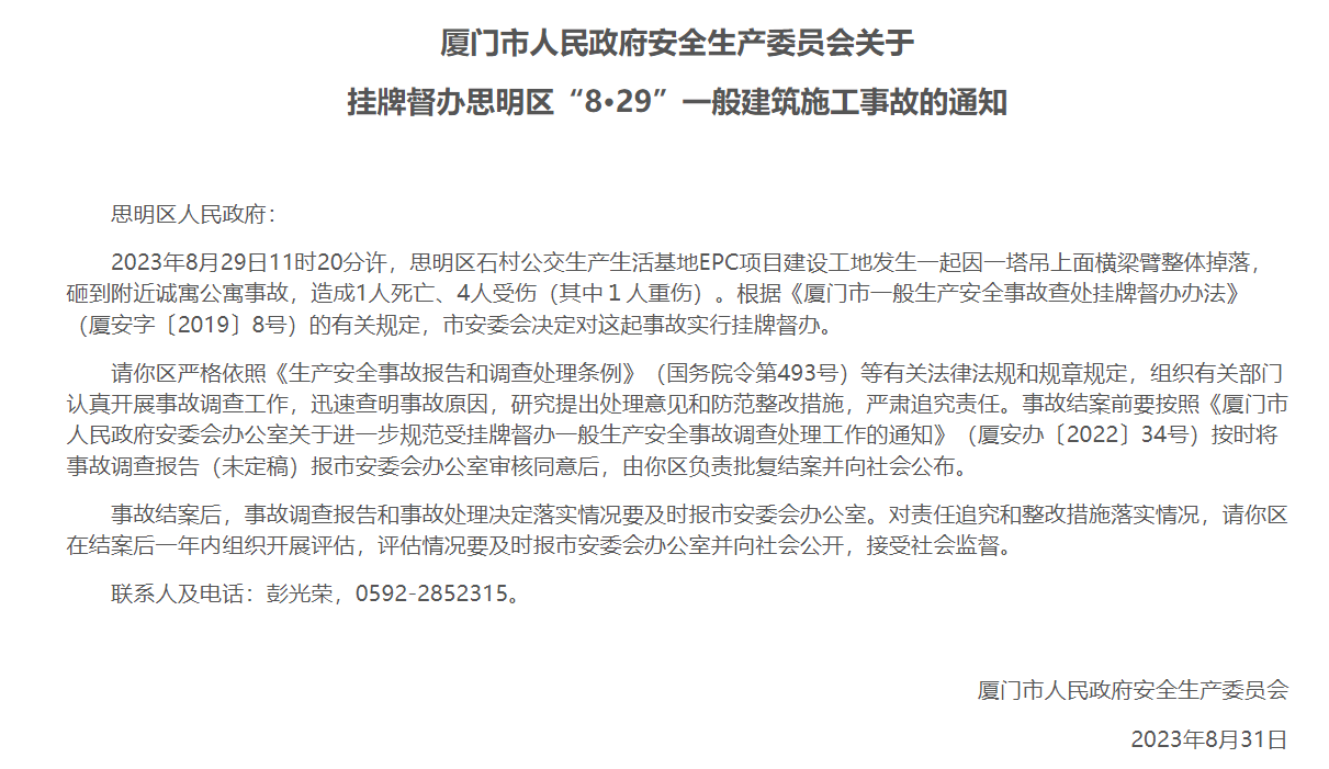 2023年8月29日11时20分许,思明区石村公交生产生活基地EPC项目建设工地发生一起因一塔吊上面横梁臂整体掉落,砸到附近诚寓公寓事故,造成1人死亡、4人受伤(其中1人重伤)。根据《厦门市一般生产安全事故查处挂牌督办办法》(厦安字〔2019〕8号)的有关规定,市安委会决定对这起事故实行挂牌督办。