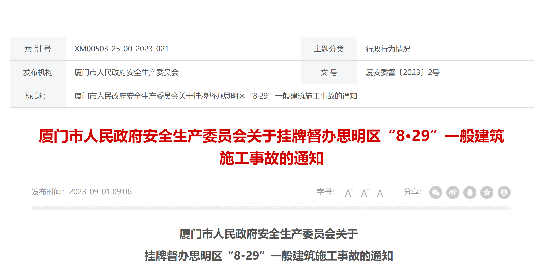 中国质量新闻网讯 近日,厦门市人民政府安全生产委员会发布关于挂牌督办思明区“8·29”一般建筑施工事故的通知。