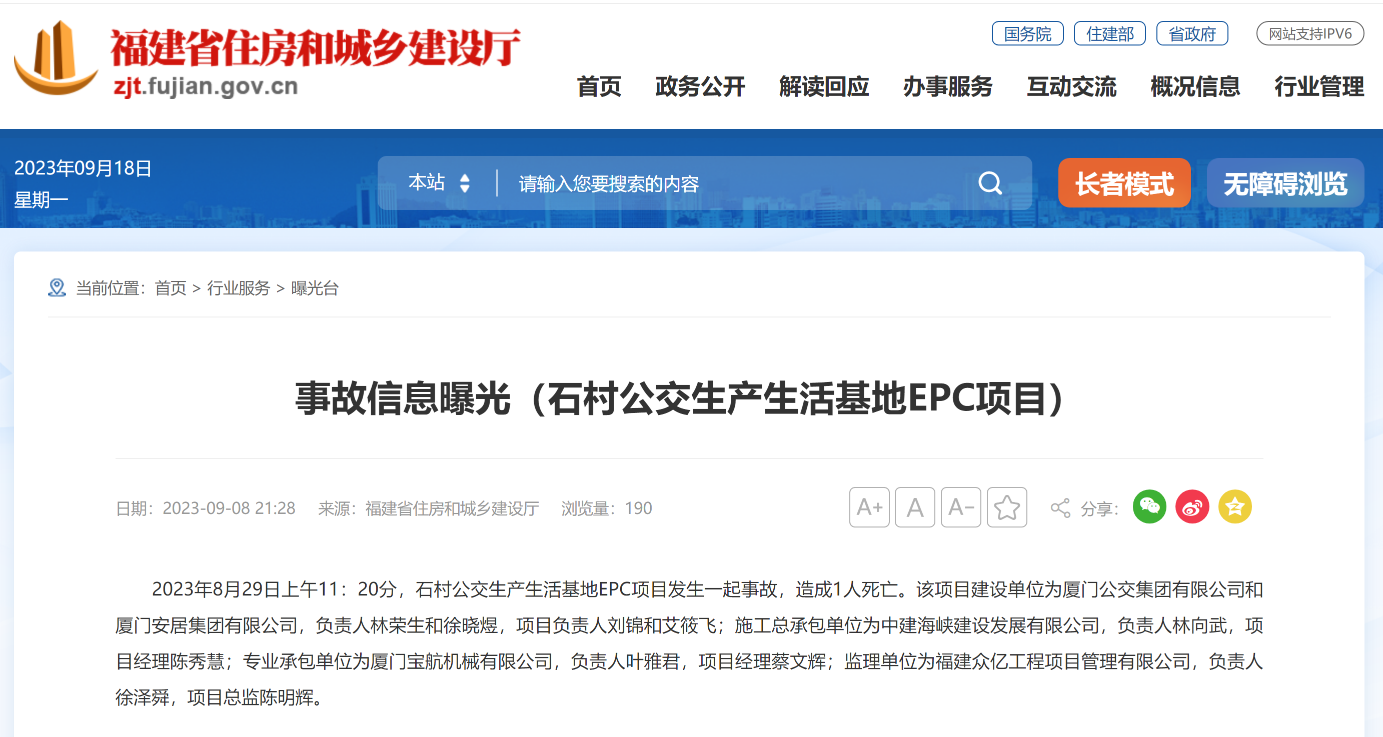 此外,9月8日,福建省住房和城乡建设厅发布事故信息曝光(石村公交生产生活基地EPC项目)显示,2023年8月29日上午11:20分,石村公交生产生活基地EPC项目发生一起事故,造成1人死亡。