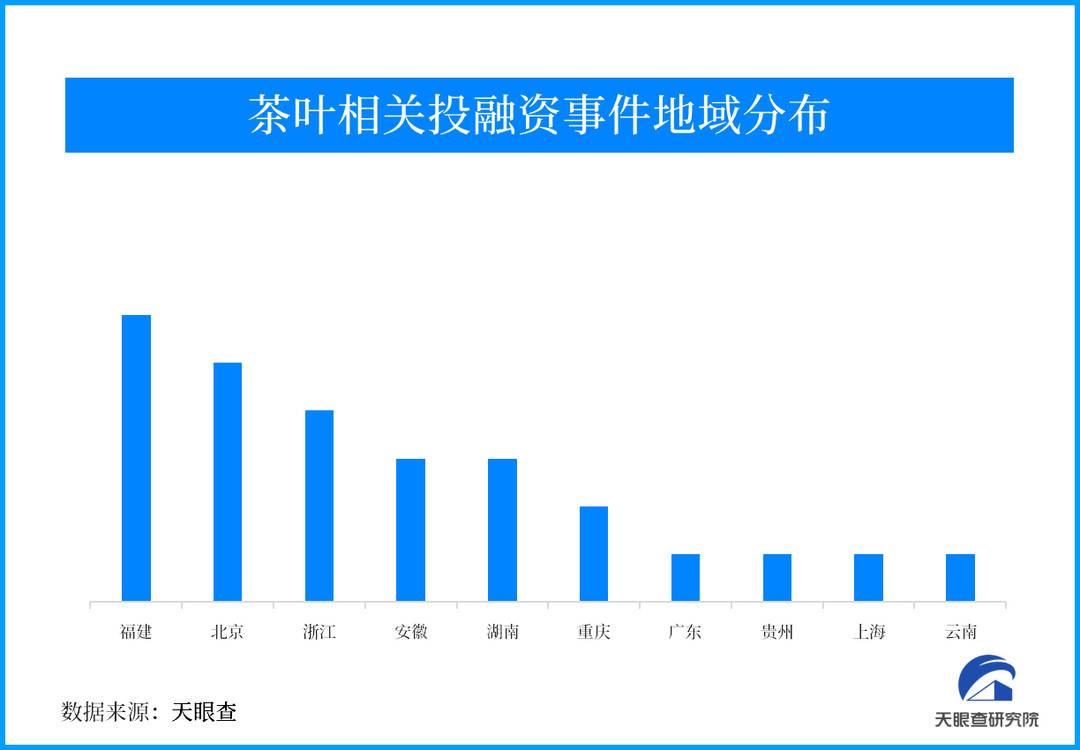 从茶叶融资事件的地域分布来看,福建、北京、浙江三地,融资事件位居前列,分别拥有5起、5起以及4起。除上述3个地区外,安徽与湖南以3起融资位列其后。从融资事件的地域来看,基本与我国茶叶的主要产区呈正相关的关系。