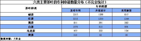 从茶叶申请专利的分布侧面反映出不同种类茶叶的受欢迎程度以及发展的成熟度。绿茶、红还是受到较多“关注”的类型。