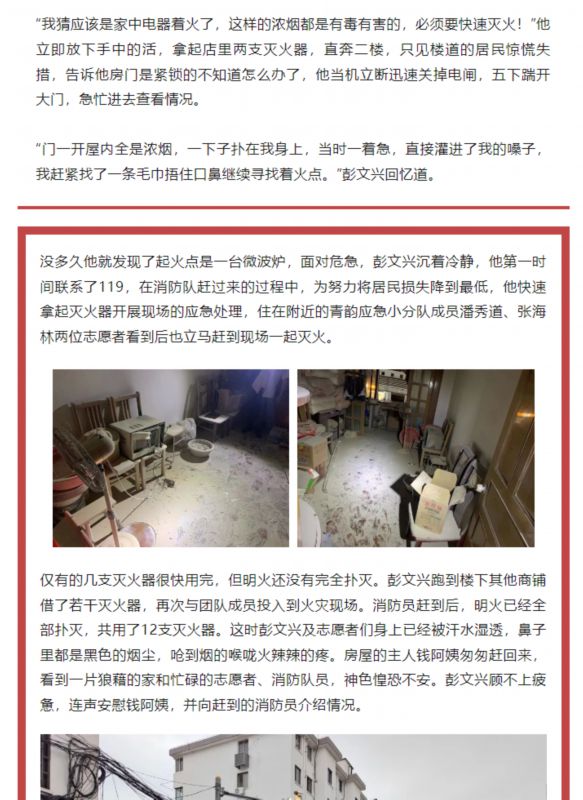 记录着青村镇青韵商户联盟应急小分队发现一户居民家的火情,立即展开救援,十分钟左右消防队赶到,合力将微波炉引发的火灾控制住。后续镇红十字开展应急救护培训,从发现险情到救危排险再到能力提升,我们看得到是迎难而上的勇气,感受到的是齐头并进、时不我待的责任感。