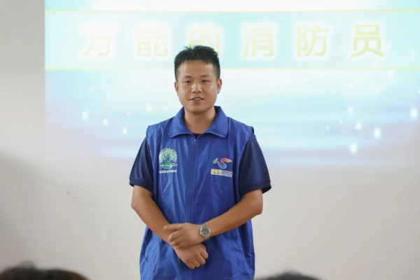 青村镇消防队队长向乾分享《万能的消防员》。说起“福福话安全”消防志愿项目,已经连续了近五年,其中经历过队员全盘翻新,可志愿行动一直在。