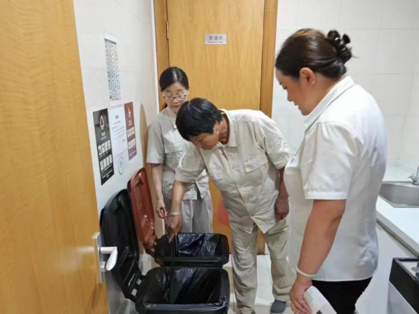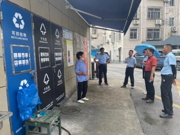 在各社区物业公司、舜浦大楼、仁瑞护理院等,一线物业人员、工作人员经过专题培训后,每日定点巡查,发现问题及时整改。同时,通过发放垃圾分类宣传资料、张贴宣传海报、规范分类检查上墙制度,自觉成为垃圾分类工作的实践者、宣传者、倡导者、推广者。
