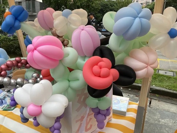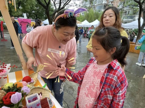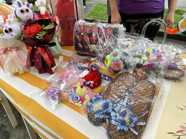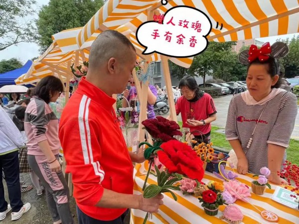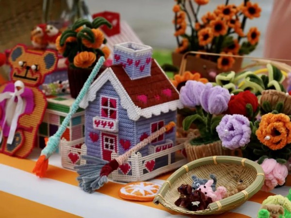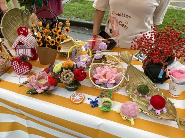 “走过路过,瞧一瞧看一看咯!”在社区公益市集上,一声声响亮的“吆喝声”吸引了不少居民驻足观看。摊位上摆满了各种琳琅满目的匠人手工作品,其中有手工拖鞋、针织摆件,还有神奇的扭扭棒手工作品,由一根毛茸茸的铁丝,扭一扭、弯一弯,随意造型,就能做出多种多样的趣味造型,定睛一看,有小动物、有植物、有小鞋帽还有灯饰,个个是独具匠心。