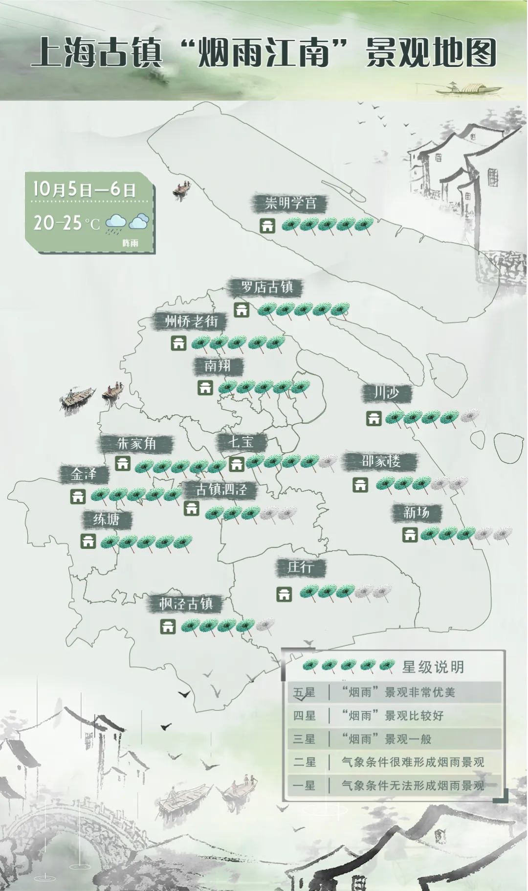 请关注实时客流情况,避免拥挤。气温有波动,适当调整衣着,10月5日至6日阴雨(雾)天气,可享受周边古镇烟雨风情,出行方面注意交通安全。