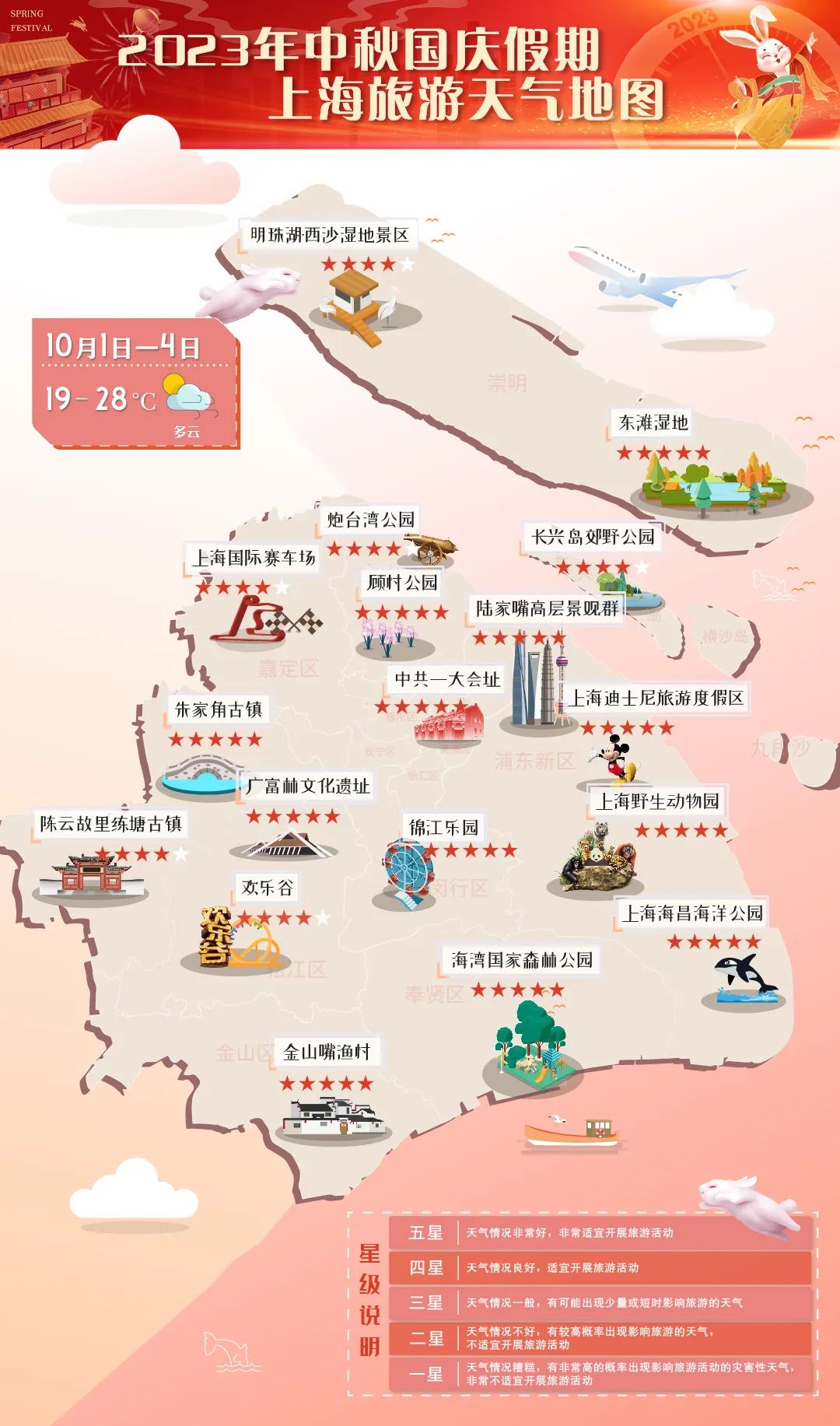 长假期间上海无高温影响天气,气温适中,气象条件总体有利于旅游活动的开展。中秋佳节,本市夜间云量较多,赏月条件不理想,只能偶尔在云隙中一窥真容。10月1日至4日多云为主,各景点适游条件佳,大家出行可能较为集中。
