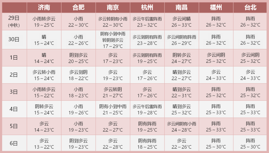 9月29日至10月1日,华东大部地区受冷空气影响自北向南有一次降水过程,局部地区降温幅度可达4~6度。