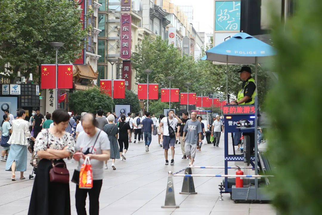 在现场丨国旗妆点步行街,双节氛围正浓厚