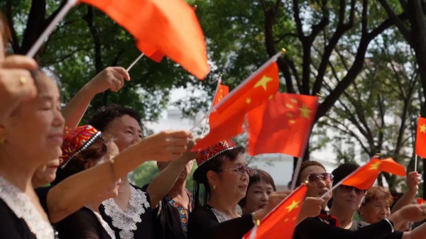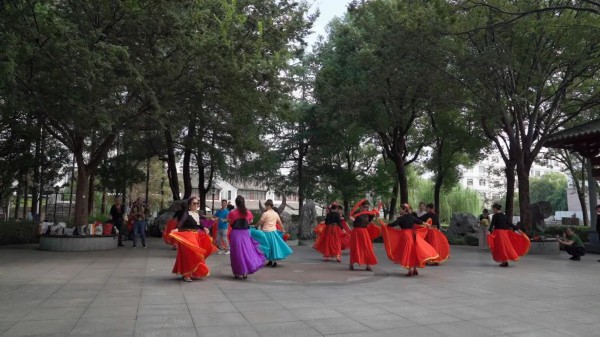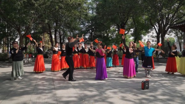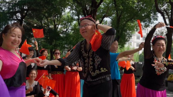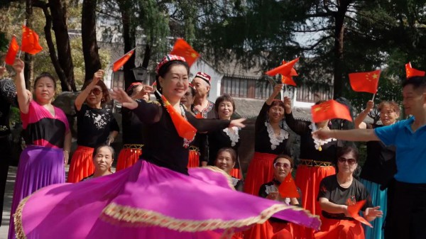 据夕阳红老年舞蹈队队长翟阿姨介绍,舞蹈队的队员中有不少是从新疆返沪的知青。作为生在新时代、长在红旗下的共和国同龄人,大家纷纷自发来到家附近的公园,以欢快的节奏,唱出美好祝福、跳出最美舞姿,以此表达对党和国家的深厚的情感。