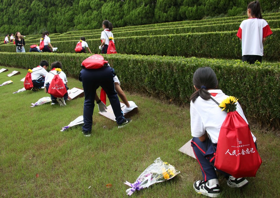 同学们擦拭烈士墓碑并献上鲜花 申卫星 摄