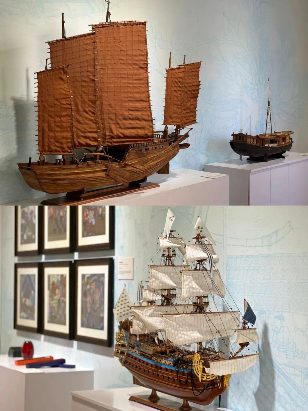 “古船微缩复制技艺”项目选送的中西式样船模《中国沙船》《汴河船7号泊位客船》与《法国“皇家太阳”号》等作品。