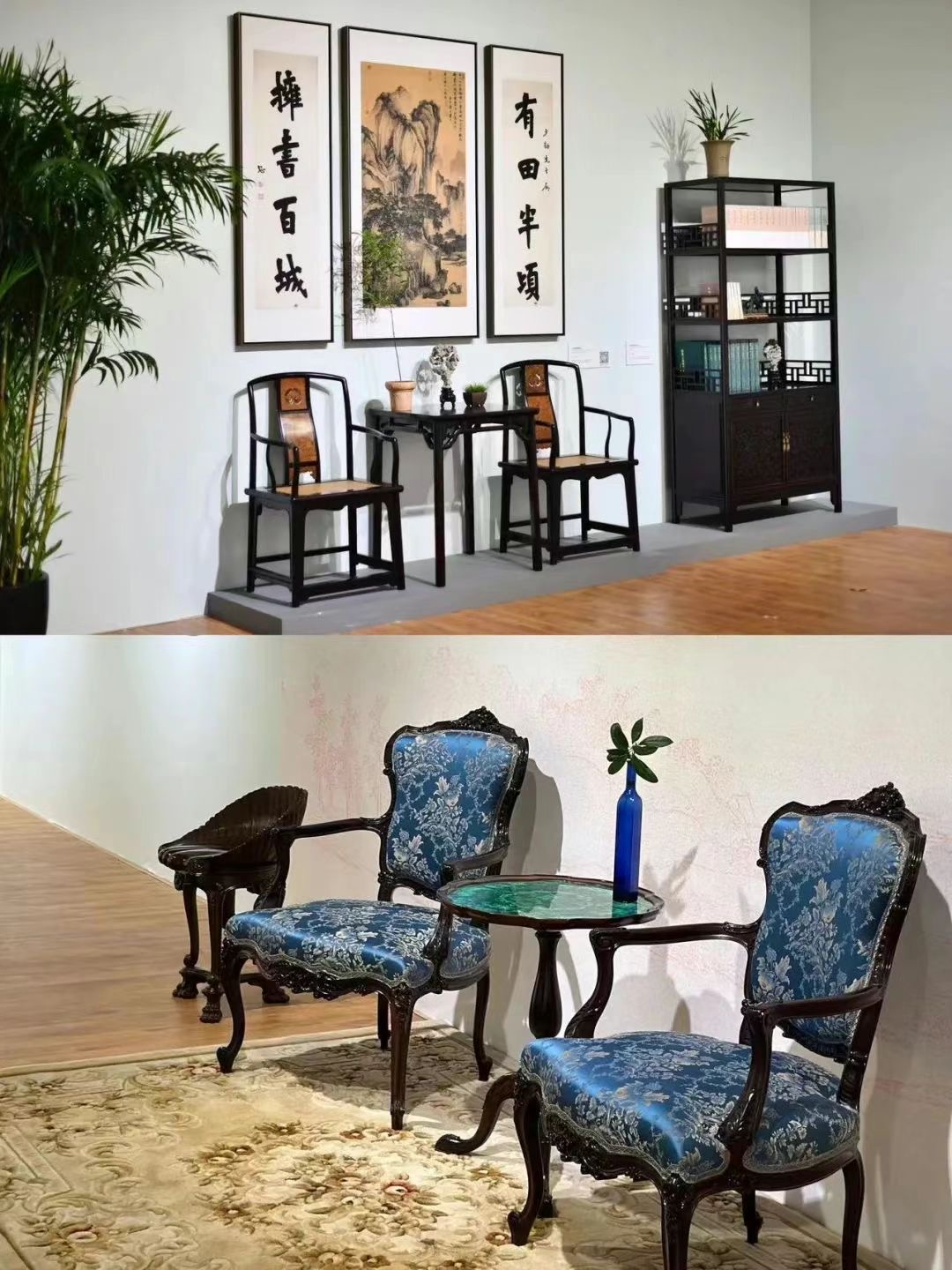 “海派家具(揩漆)制作技艺”项目选送的海派风格家具《低靠背咖啡椅系列》《贝壳椅》等作品。