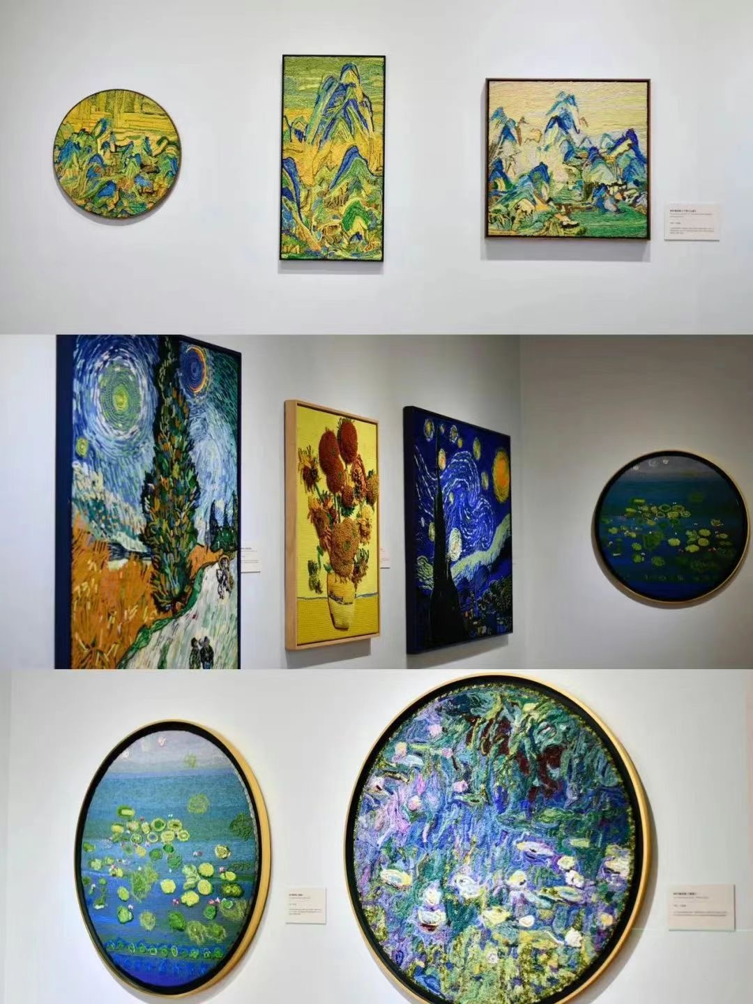 “莘庄钩针编结技艺”项目选送的钩针编结画《千里江山图》以及钩针编结画《星空》《向日葵》《有丝柏的道路》《睡莲》等作品