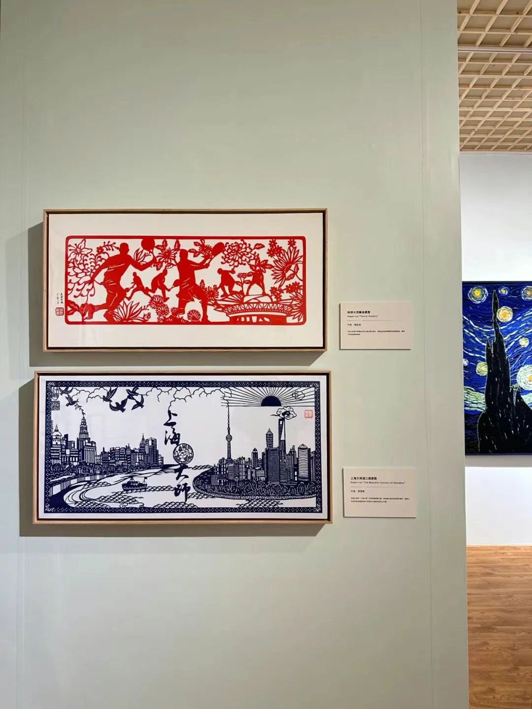 展品中还有凸显网球赛事主题的颛桥剪纸作品《网球大师赛场景图》《上海大师浦江美景图》。