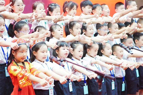 伴随着《我爱北京天安门》欢快的音乐,孩子们登场啦!他们用稚嫩的童声唱响《娃哈哈》《红红的太阳》《大中国》《祖国祖国我们爱你》《党是太阳我是花》……飞扬的歌声、熟悉的旋律,那是独属于观澜小小少年的积极向上,那是独属于观澜小小少年的对祖国的美好祝福。