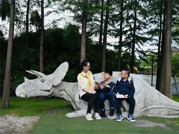 一入公园,孩子们直奔悦林大道上的“恐龙乐园”。园区内有好莱坞电影水准的恐龙仿真机械模型:霸王龙、暴龙、翼龙、剑龙、三角龙,肿头龙等等恐龙家族成员,从它们身边经过时,这些“远古霸主”会突然苏醒过来和你“打个招呼”。