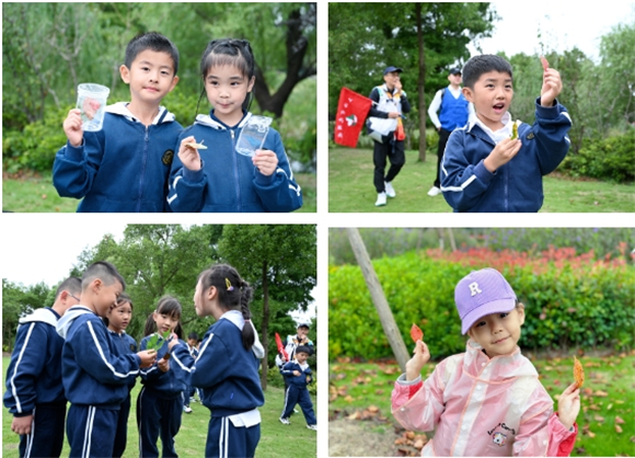 在秋游社会实践活动的尾声,老师带着同学们制作落叶书签。大家在草地上捡拾自己心仪的漂亮落叶,把它制作成属于自己的、独一无二的书签,这份追寻秋日童话的心也被定格在这美好的瞬间。
