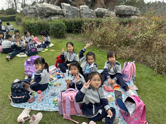 在阳光明媚的草坪上,老师和孩子们摊开野餐垫,开始午间的美食盛宴!大家从背包中拿出精心准备的美食,欢聚在绿草如茵的野餐地。