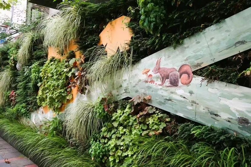 这座建设面积约150平方米的垂直绿墙以植物为主要元素,结合观赏特性、生长特性、和养护需求精选植物品种。建成后的垂直绿墙由火焰南天竹、金叶石菖蒲、矾根等植物打造,并采用了更加科学的浇灌系统,降低绿墙的养护成本,绘就亦山亦云的锦绣图景。