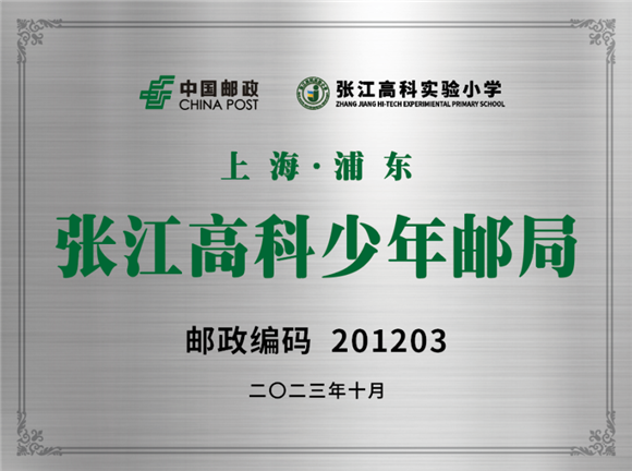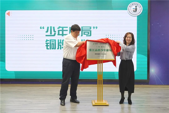 中国邮政集团有限公司上海市浦东新区分公司副总经理周童先生、张江高科实验小学陈飞校长为少年邮局铜牌揭牌。