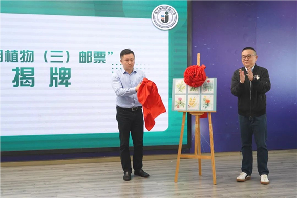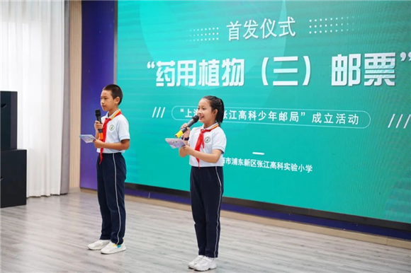 张江邮政支局局长沈世博先生、张江高科实验小学香楠校区执行校长胡梁老师共同为药用植物(三)邮票揭牌。