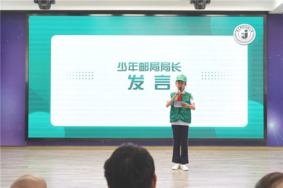 少年邮局局长蔡宜轩同学上台发言,她表示她为自己能有幸担任这个职务而感到自豪。她将继续认真学习邮政的基本知识,熟悉和掌握基本技能,尽快胜任局长的工作。不论在学习、工作,还是生活上,都会起到模范带头作用。她还要以自己的模范作用,带动“小局务员们”为其他的同学做好各项服务,让同学们满意。
