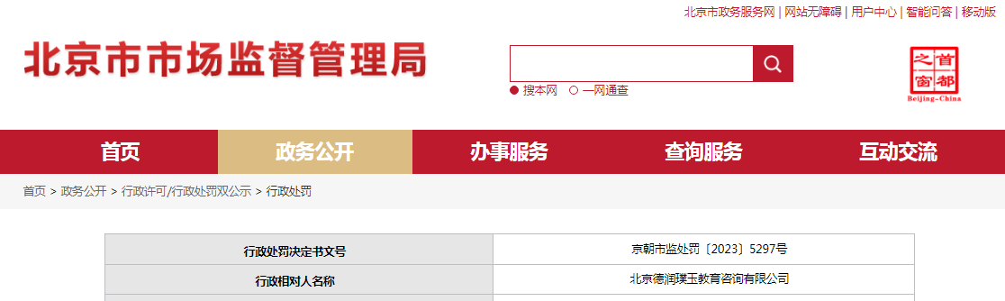 中国质量新闻网讯 近日,北京市朝阳区市场监督管理局对北京德润璞玉教育咨询有限公司作出行政处罚。行政处罚决定书文号:京朝市监处罚〔2023〕5297号。