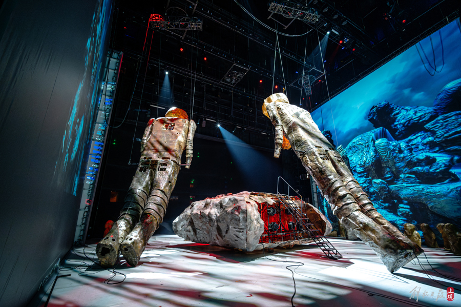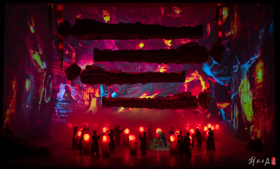 巨大的舞台装置,为这部来自德国的史诗传说建构起充分的视觉张力;而舞台三面使用的大型高分辨率投影仪,呈现出色彩缤纷,图案精美的空间图景;结合不同时色系的灯光设计,为这部场景调度的作品提供了丰富的感观。