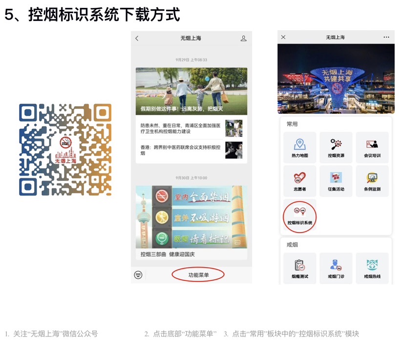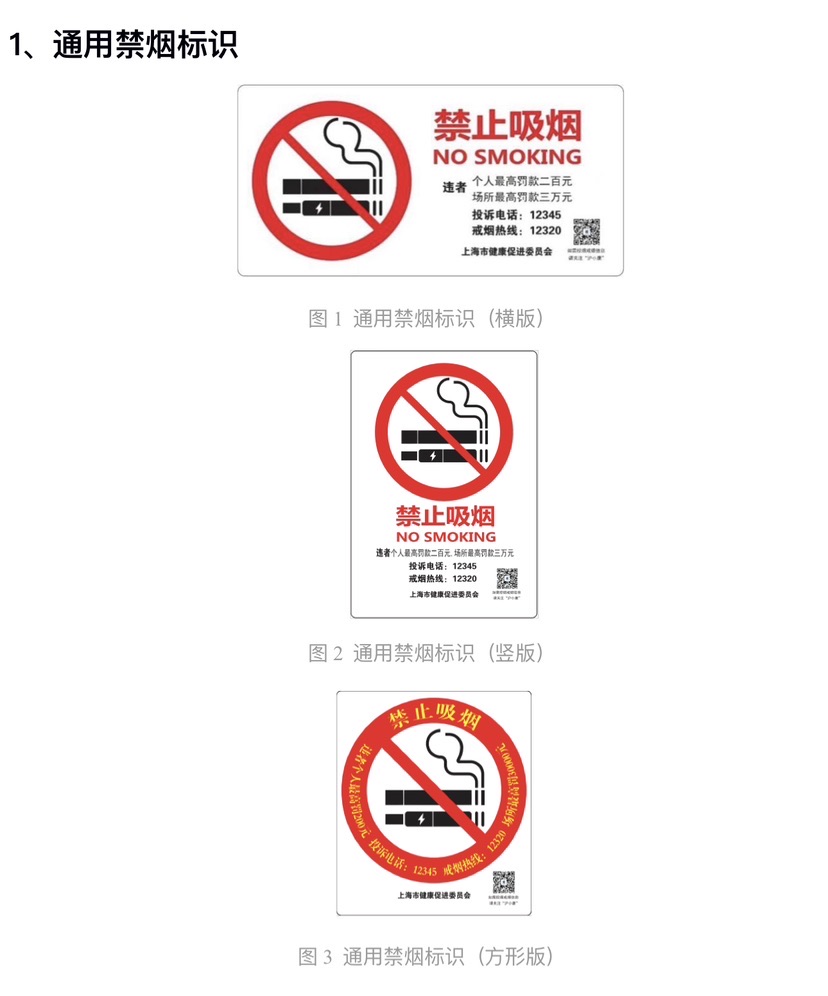 为便于场所单位合理规范设置控烟标识系统,市健康促进委员会制作控烟标识系统的电子文档,供下载使用。关注“无烟上海”微信公众号,点击底部“功能菜单”,点击“常用”板块中的“控烟标识系统”模块,即可下载。《规范》强调,标识的样式可根据场所实际情况选用,大小可等比例缩放,但必须确保清晰醒目;标识不应拆分、旋转、非等比变形扭曲等改造使用;标识的材质应经久耐用,应定期进行更新或维护。