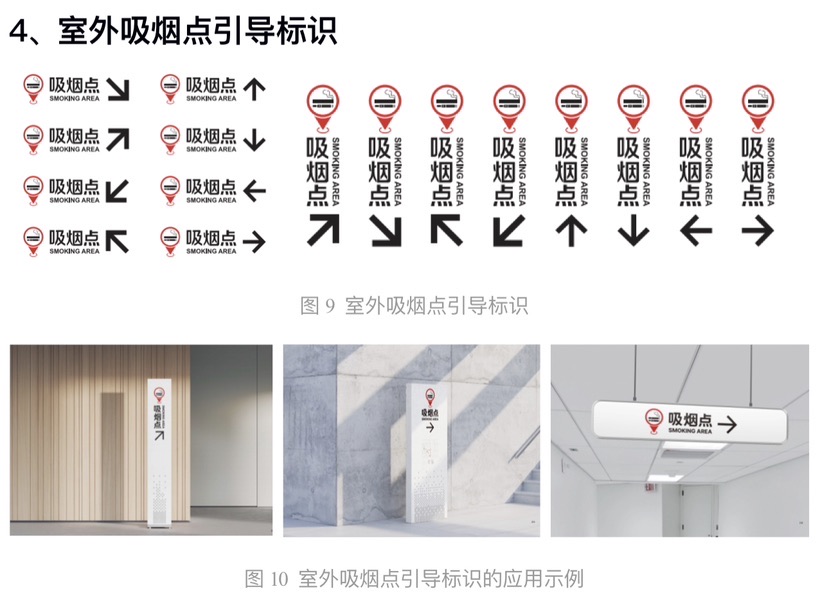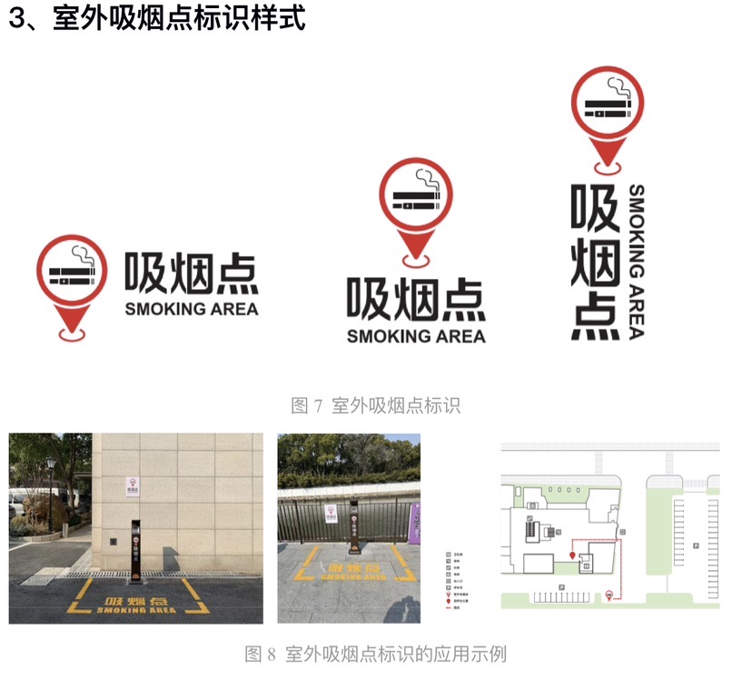 此外,室外吸烟点标识,用于吸烟点的位置标识或提示,如室外吸烟点所在处、(电子)地图中、吸烟点设施设备等,其核心元素包括吸烟点图形和中英文文字“吸烟点”、“SMOKING AREA”。而室外吸烟点引导标识,用于吸烟点的位置方向指示,如在室外允许设置吸烟点的场所,应在室外吸烟点所在区域、周围环境、场所室内区域等设置吸烟点引导标识,其核心元素除了吸烟点图形和中英文文字“吸烟点”“SMOKING AREA”之外,还有方向指示箭头。