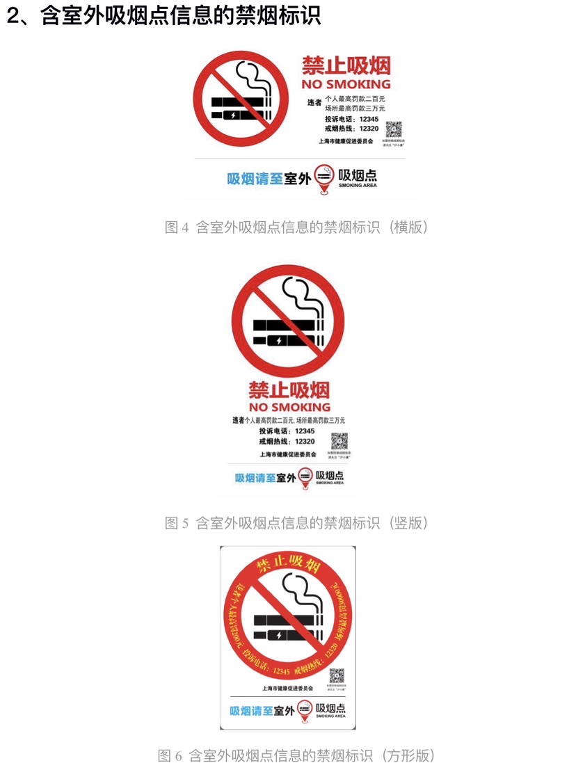 《规范》明确,本市控烟标识系统包括禁烟标识、室外吸烟点标识和室外吸烟点引导标识(详见附件)。其中,禁烟标识为禁止吸烟警示图形,烟草制品图形包括传统卷烟和电子烟,配有中英文文字“禁止吸烟”“NO SMOKING”,明确“违者个人最高罚款二百元,场所最高罚款三万元”的罚则,附有投诉电话12345、戒烟热线12320,单位落款一般为“上海市健康促进委员会”,也可是相关监管部门或单位,并有室外吸烟点信息,即提示该场所设有室外吸烟点。