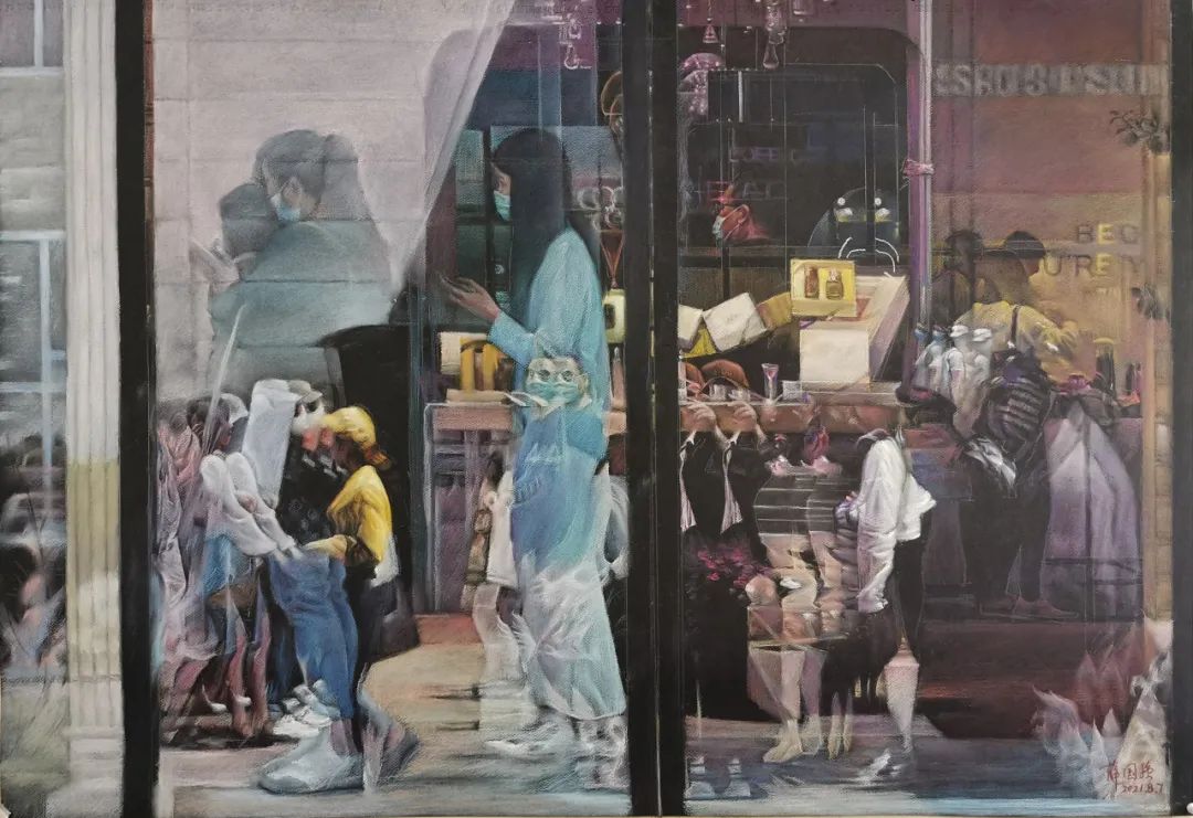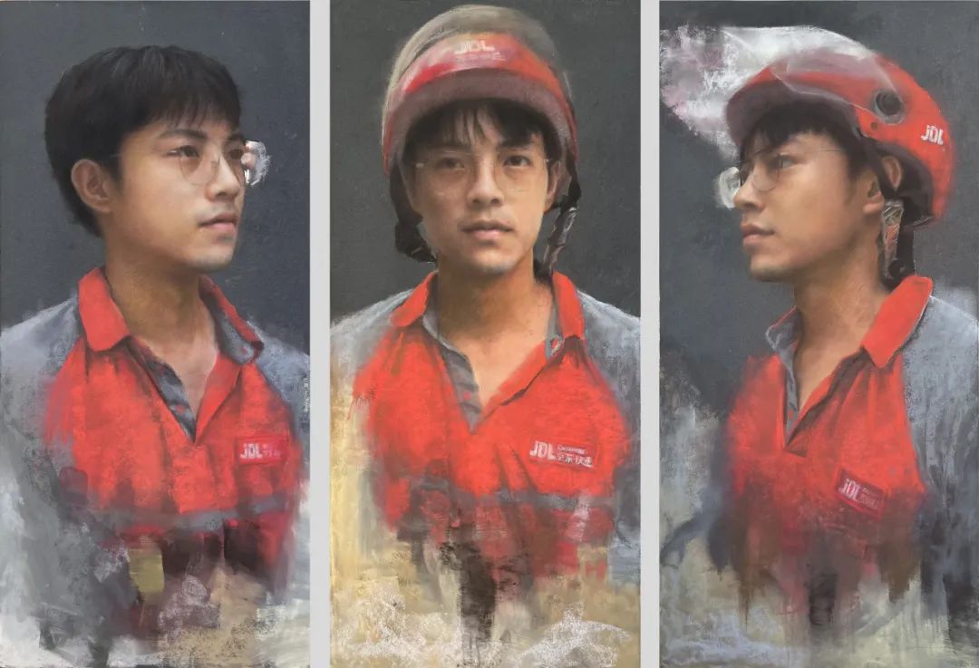 记者观察到,与往届相比,本次展览的作品在画面的完整性、艺术技法、题材构思等方面都有了显著的提高,更不失色粉画语言的趣味。薛国强的《上海都市映像》,择一场景,记录了在上海生活的人物群像,视觉上仿佛是用相机拍摄一般,镜面中的人物倒影栩栩如生;蔡敏的《器物集·富贵吉祥》,将粉画的质感展现得淋漓尽致,茶台切割面在光影间塑造出立体视感,颇具古色古韵;黄舒夷创作的《红色脉动》,则以人物的三个不同角度,展现了穿戴着红头盔与工服的快递小哥,笔触精准而真实,很值得一观。