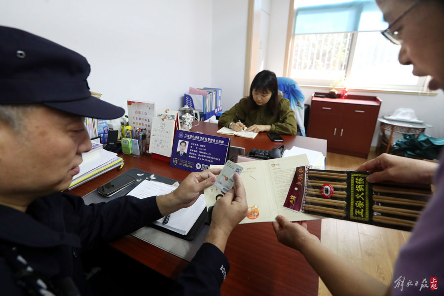 10月24日午后,瞿阿姨匆匆走进江湾镇街道方浜居委会,向社区民警求证手中的提货卡真伪。
