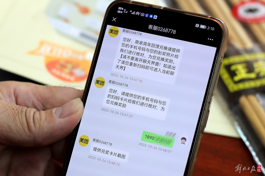 为了让瞿阿姨相信,老祝用自己的手机扫了卡上的二维码,跳出一个微信对话框,显示为“某团客服”,在提供了手机号和提货卡截图后,得到提示“这个手机号不对哦,请提供收到货的手机号”……接下来老祝开始讲起故事:马上让你进群,同伙开始“撬边”,让你相信这是真的,东西有多好不领就亏了,用上各种套路等你信以为真,如果照做就上当了……