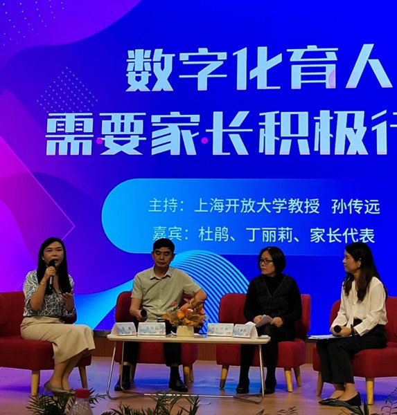 圆桌微论坛环节由上海开大教授孙传远主持,围绕“数字化育人需要家长积极行动”这一主题展开,上海开大宝山分校教师杜鹃、永德实验小学学生成长部主任丁丽莉等嘉宾以及家长代表参与讨论。