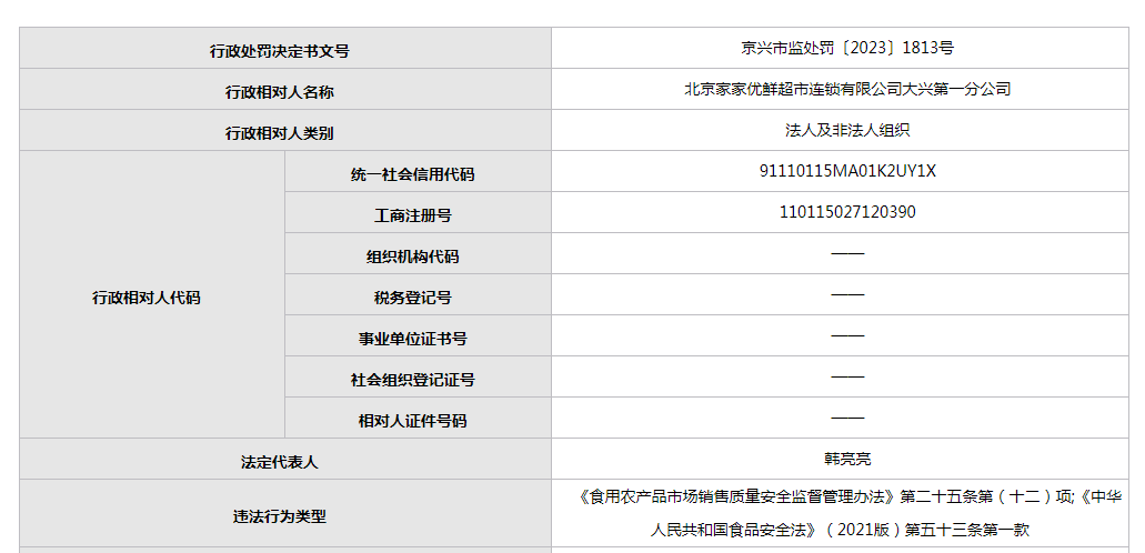 本网从北京市市场监督管理局网站还查询到,在今年9月,北京家家优鲜超市连锁有限公司大兴第一分公司曾因违反《食用农产品市场销售质量安全监督管理办法》第二十五条第(十二)项以及《中华人民共和国食品安全法》(2021版)第五十三条第一款规定被警告和罚款1000元,并被责令改正违法行为。