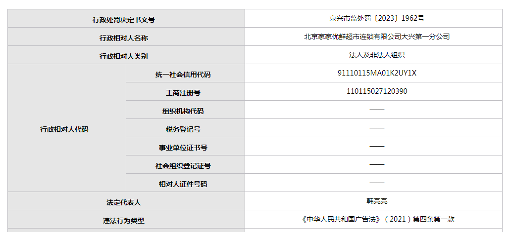 发布虚假广告、违反食品安全法 北京家家优鲜超市连锁一分公司近期收两罚单