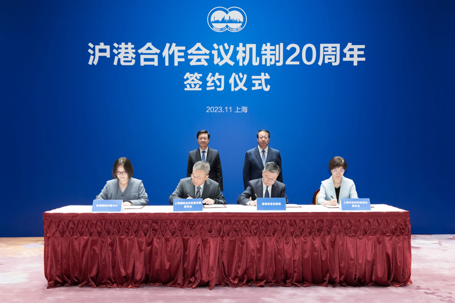 签约仪式上,上海市教委、市经信委、上海国际经济贸易仲裁委员会、临港集团分别与香港特区政府教育局、香港贸发局、香港国际仲裁中心、香港大学签署相关合作备忘录。