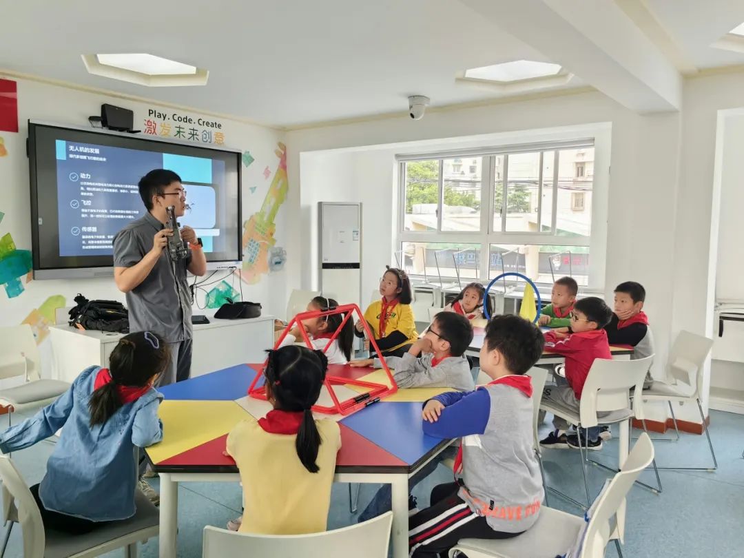 在市光新村第一小学的教室里,社区书院老师为同学们详细介绍了民用消费级微型无人机的种类、用途、飞行原理、空域规划管理以及无人机的应用领域等知识。同学们第一次近距离接触无人机,听得津津有味,纷纷表现出浓厚的兴趣,与老师积极互动。