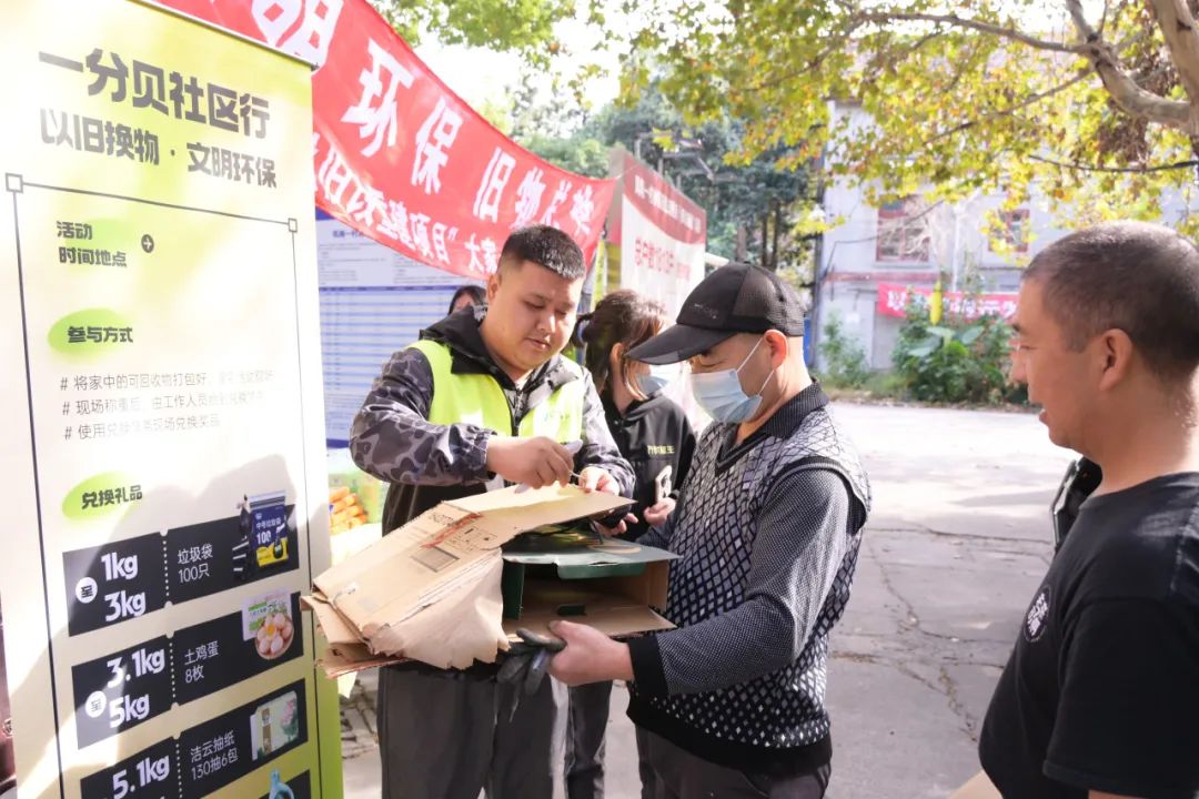 现场人头攒动,陆续有居民拿着废弃纸箱、废旧衣物前来。今年71岁的何老伯是凤南一村的居民,近日何老伯家中因搬迁清理出了一堆旧物,正愁如何处理时,他得知小区里有旧物兑换的活动,这可帮了他大忙了。