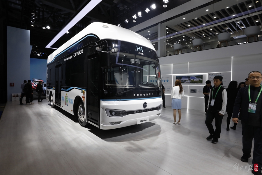 首次亮相进博会的氢燃料电池中巴北极星,由HTWO广州与厦门金旅共同研发,加满氢时续航可达600km。同时,搭载了8大行车安全辅助技术,构建全新智能安全体系。