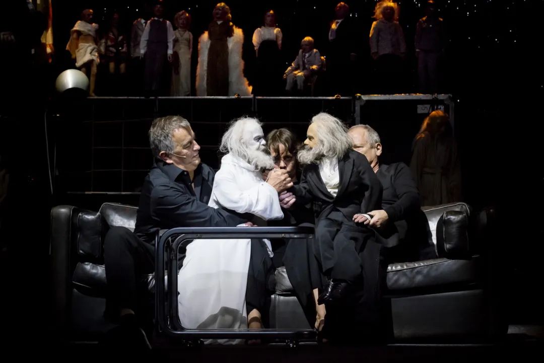 剧中,当长期流亡归来的布莱希特叼着雪茄,以经典的东柏林式形象回到剧院,光线照亮了这座现代的剧院,木偶盒子开始嘎吱作响,那些活跃在人们记忆里的历史名人:马克思、卡夫卡、佛洛依德、帕瓦罗蒂、撒切尔夫人、列宁……都将一一登场,与他和观众见面。复活的魔法限定此夜此晚,被唤醒的亡者齐聚在此,他们叙说、他们交流、他们争吵、他们歌唱。以戏剧之名,揭开一场震耳欲聋的“与亡者的对话”。
