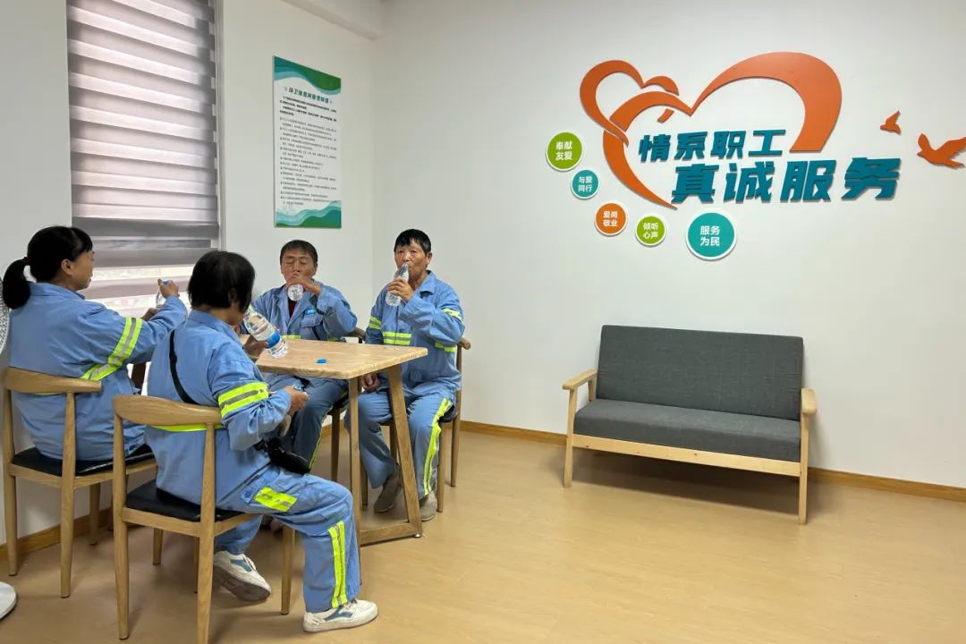 在服务点内,有不少垃圾分类知识的科普展示,方便前来的市民朋友们观看和学习。在二楼还贴心地设有环卫工人爱心驿站,里面的微波炉、冰箱均可免费使用。要是渴了累了,欢迎各位环卫工人们来此歇歇脚、避避雨。